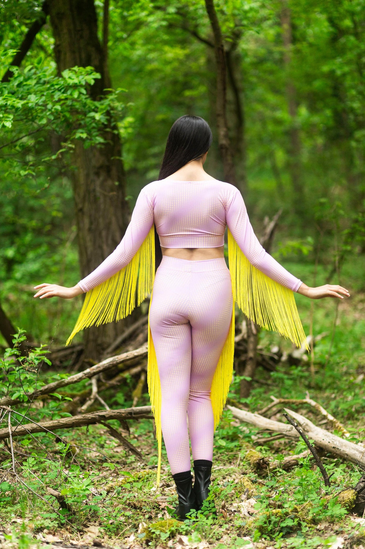 These full-length leggings in soft pink feature the moon phase pattern of 2030–2040 in radiant yellow – energetic, rhythmic, unmistakable. Flowing yellow fringes bring motion and lightness to every step. Handmade and unique. A limited-edition tribute to lunar beauty – made to move, shine, and transform with you.