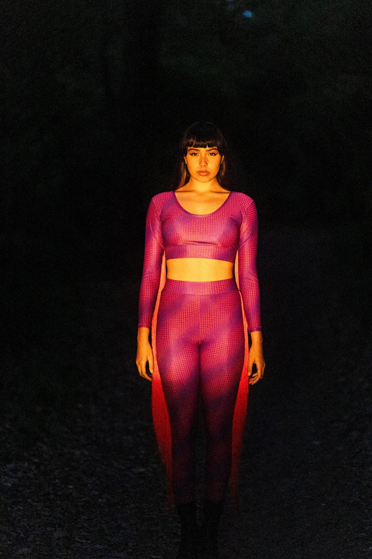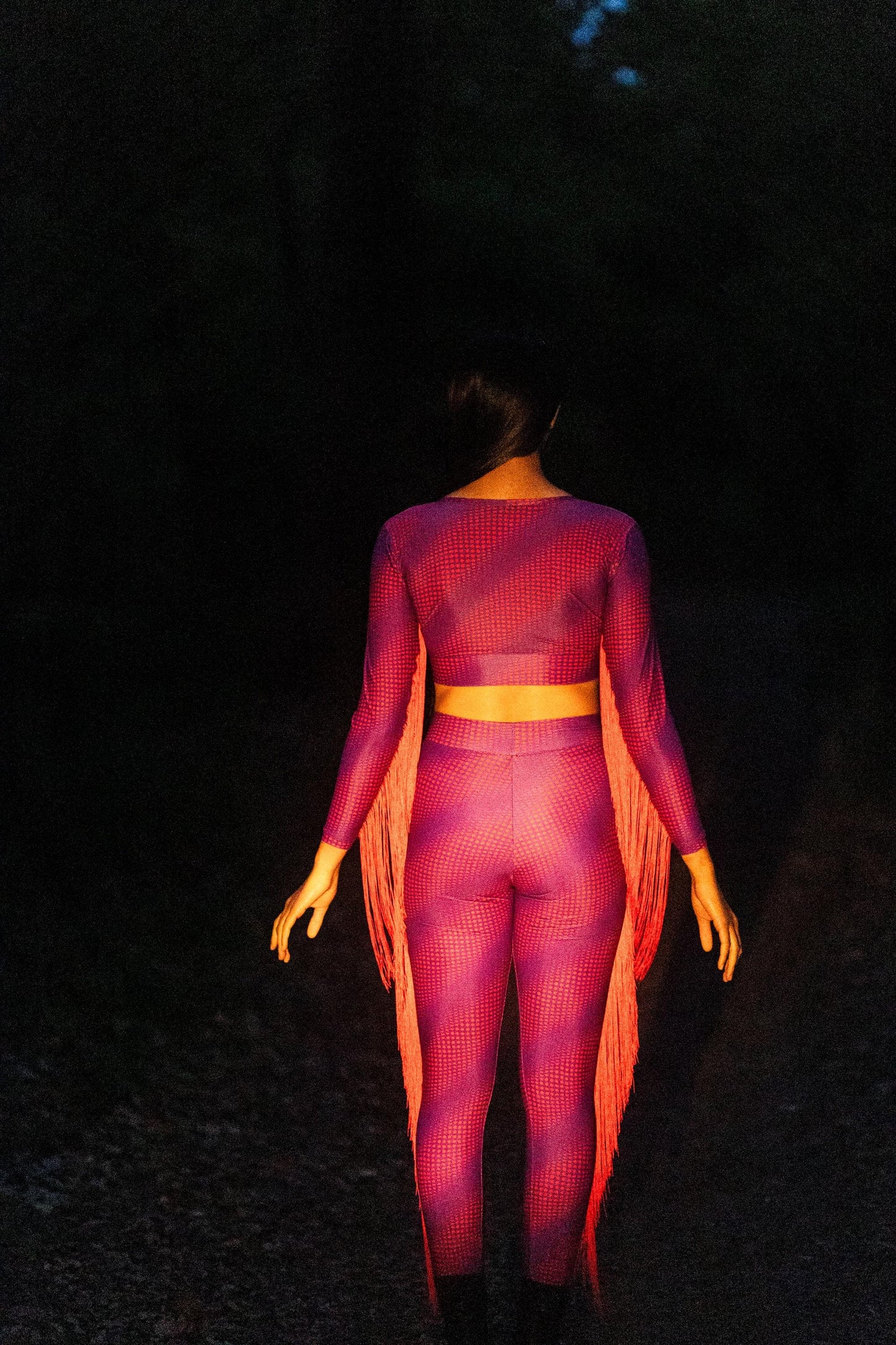 These full-length leggings in violet are printed with the moon phase pattern of 2030–2040 in deep red – bold, striking, unmistakable. Red fringes bring flow, power, and visual energy to each movement. Handmade and unique. A limited-edition tribute to lunar beauty – made to move, shine, and transform with you.