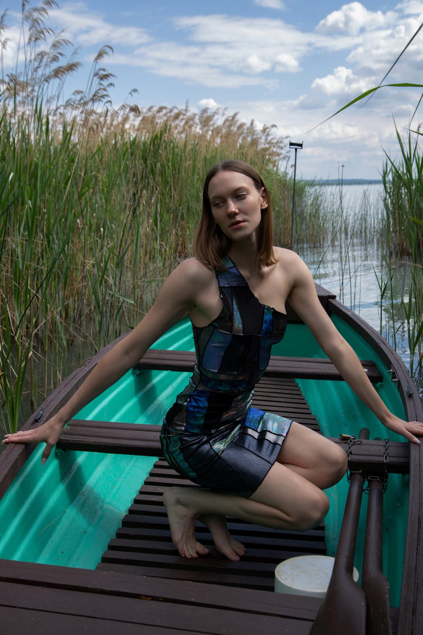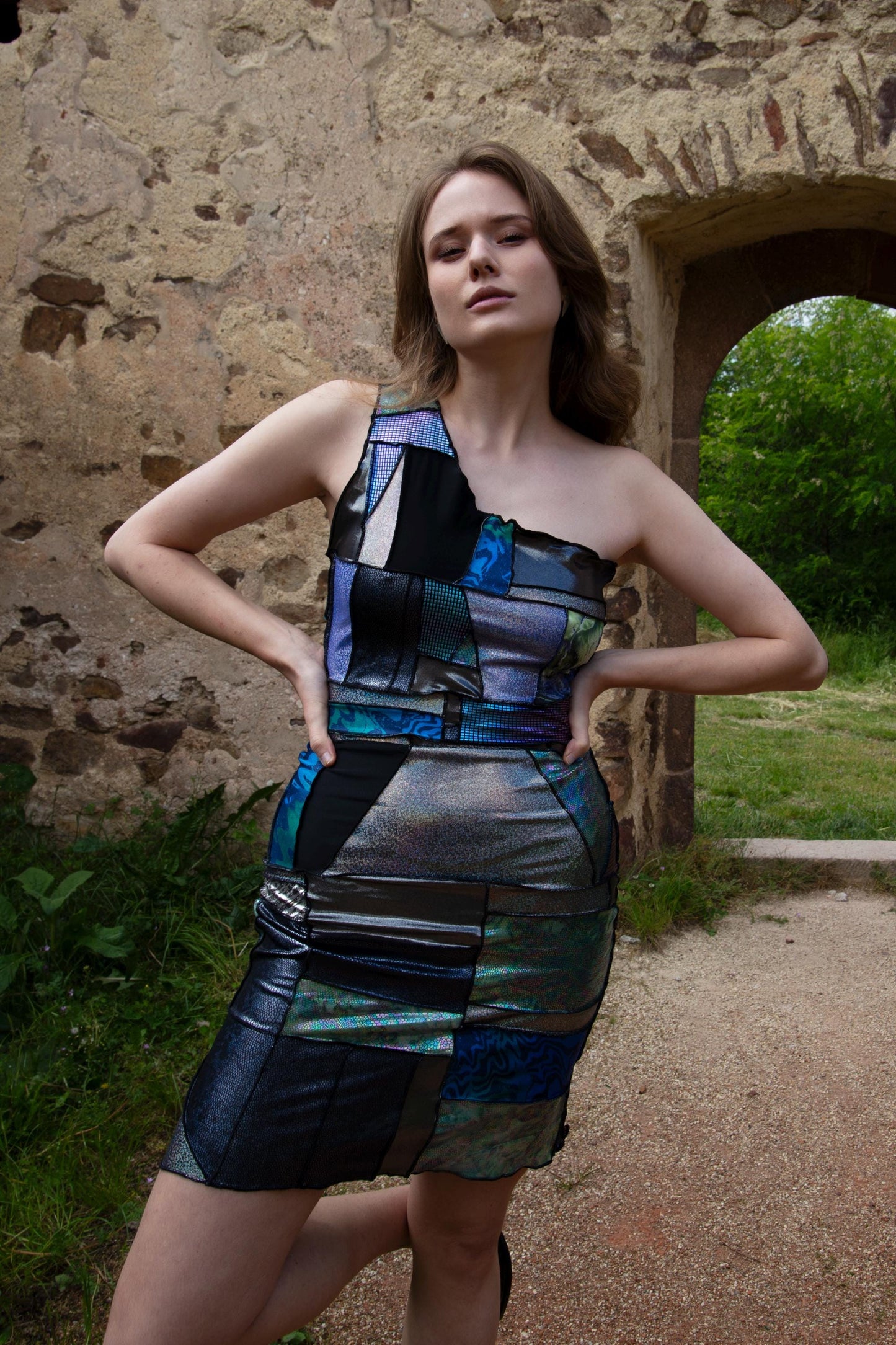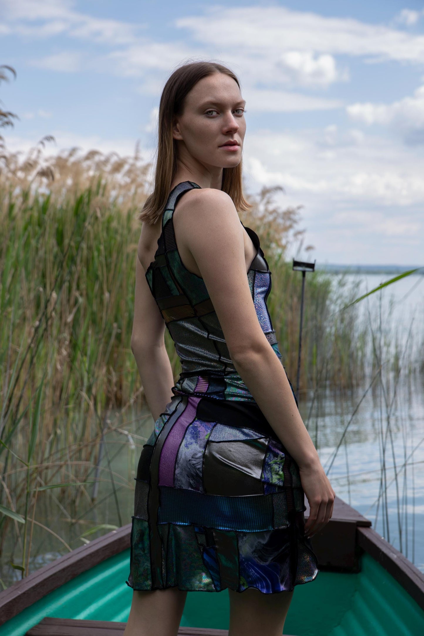 This dress features a striking bustier-style bodice and sleek mini skirt combined into one bold silhouette, crafted from a patchwork of glossy, dark-toned fabrics in shades of deep plum, midnight blue, charcoal, and onyx. The fitted top shapes the torso with structure and support, while the clean A-line skirt adds movement and balance. With its subtle sheen, rich color palette, and asymmetrical strap detail, this piece is equal parts edgy and elegant—perfect for night outs, events, or any moment that calls for confident, standout style.