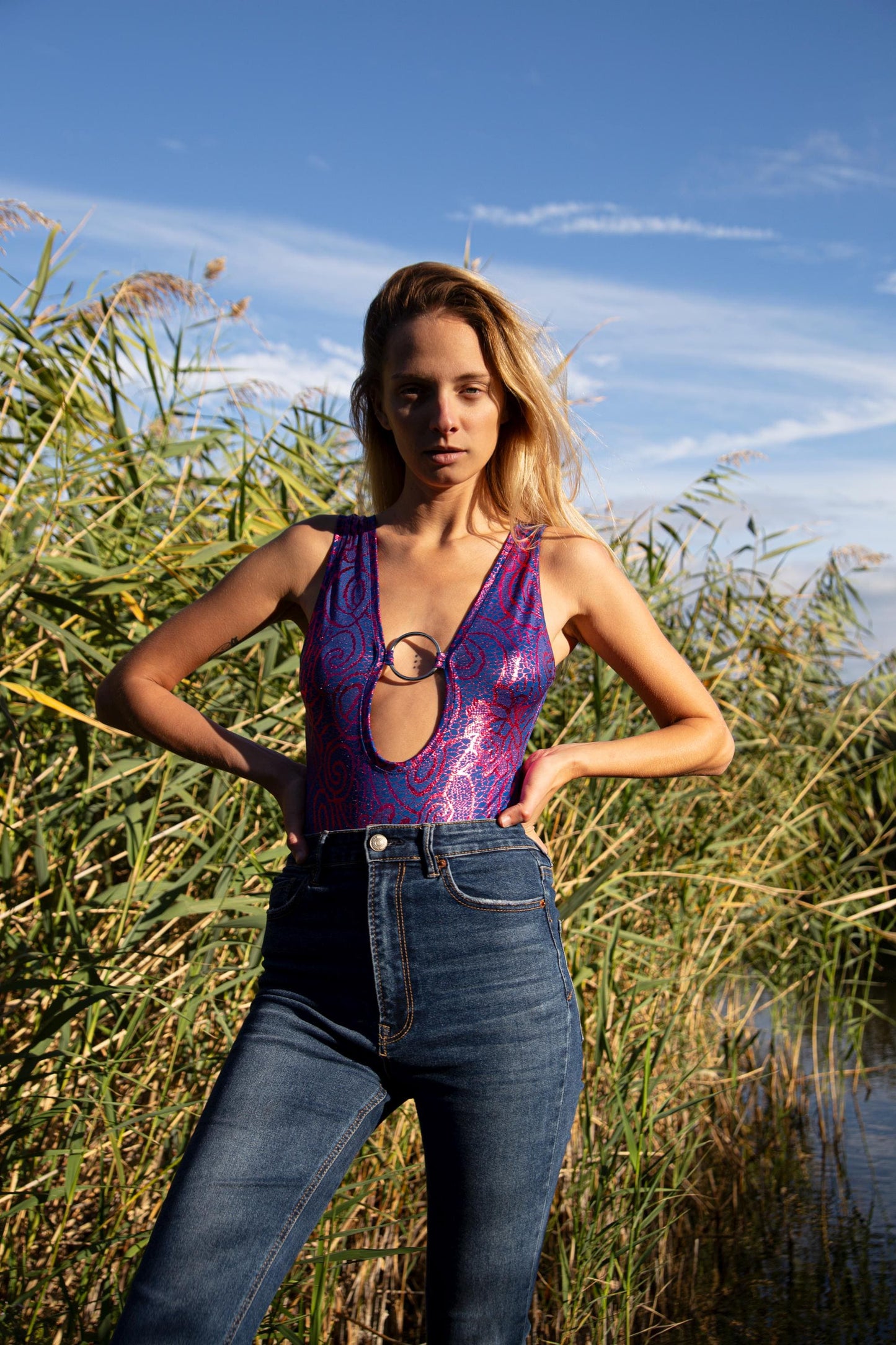 Show off your curves in our Austin bodysuit and feel both sassy and classy while you dance the night away. Wear it to the beach or club. The steel metal ring in front holds everything in its place, making you feel both attractive and easy going. Plus, its lightweight and stretchy fabric makes it perfect for traveling.