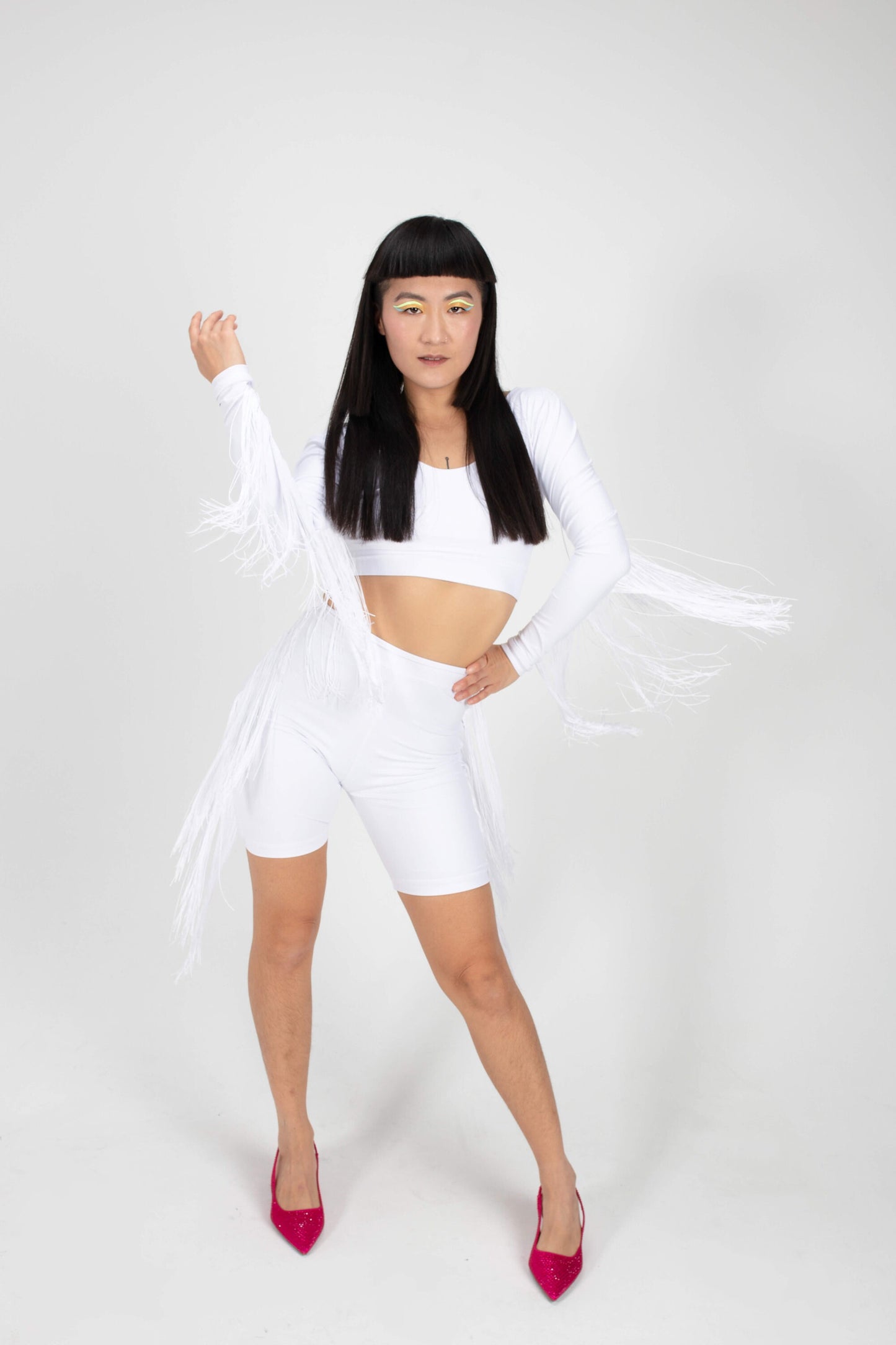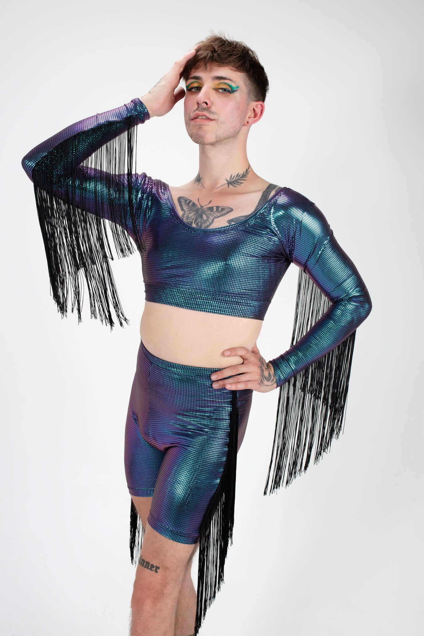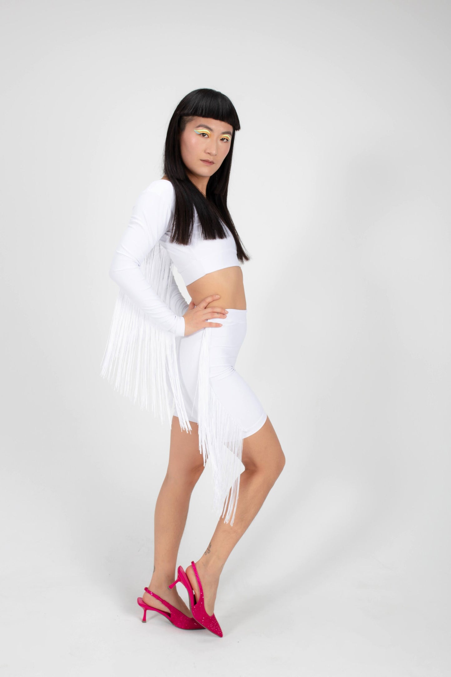These edgy biker shorts combine sleek style with a playful twist. Made from a form-fitting, stretchy fabric, they offer both comfort and a flattering fit. The standout feature is the fringed detailing along the sides, adding movement and a bold, fashion-forward touch. Perfect for festivals, casual outings, or making a statement at the gym, these biker shorts bring a unique blend of practicality and flair to any look.
