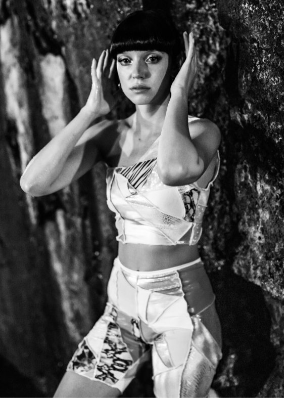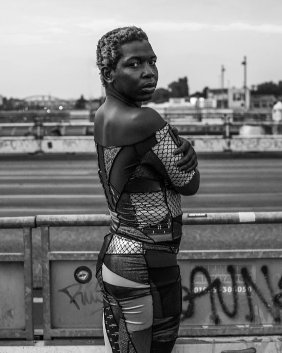 Since 2018, her designs have also been available through an online shop, where customers can choose their favorite designs and select from 12 in-stock fabrics. Every piece is made-to-order and crafted in-house at her Berlin-Neukölln studio. She sources holographic, glittery, neon, and exotic-patterned fabrics, transforming them into sleek, durable, sexy, and relaxed garments.